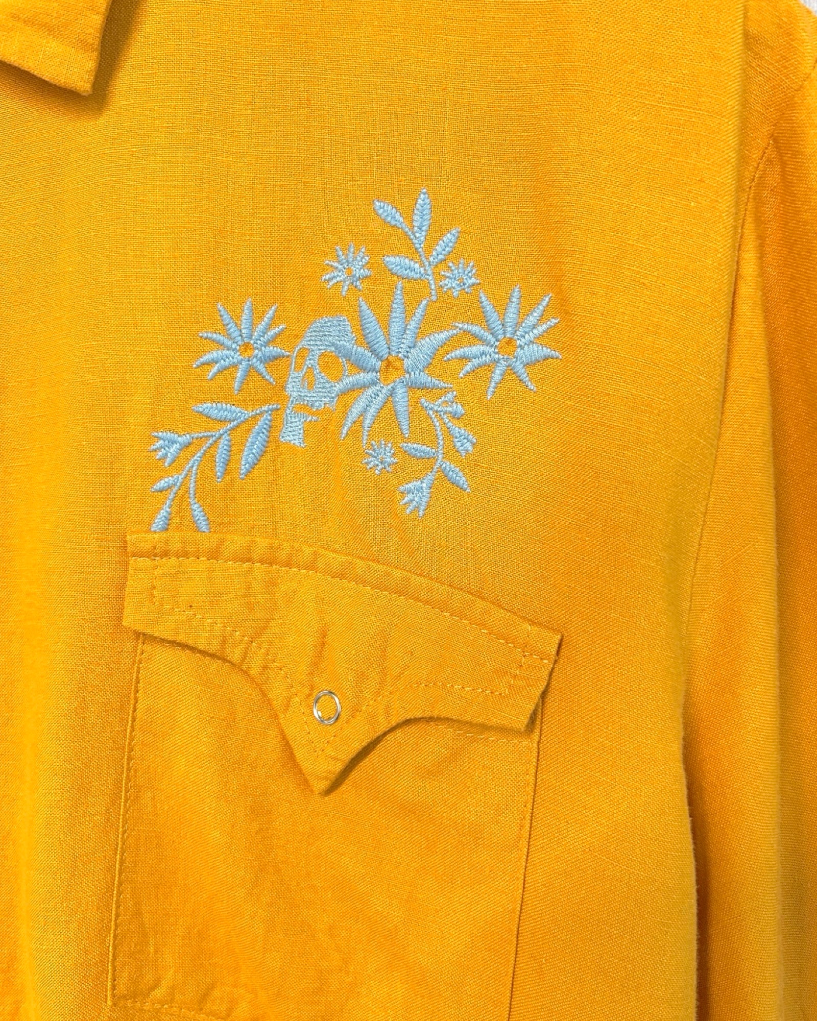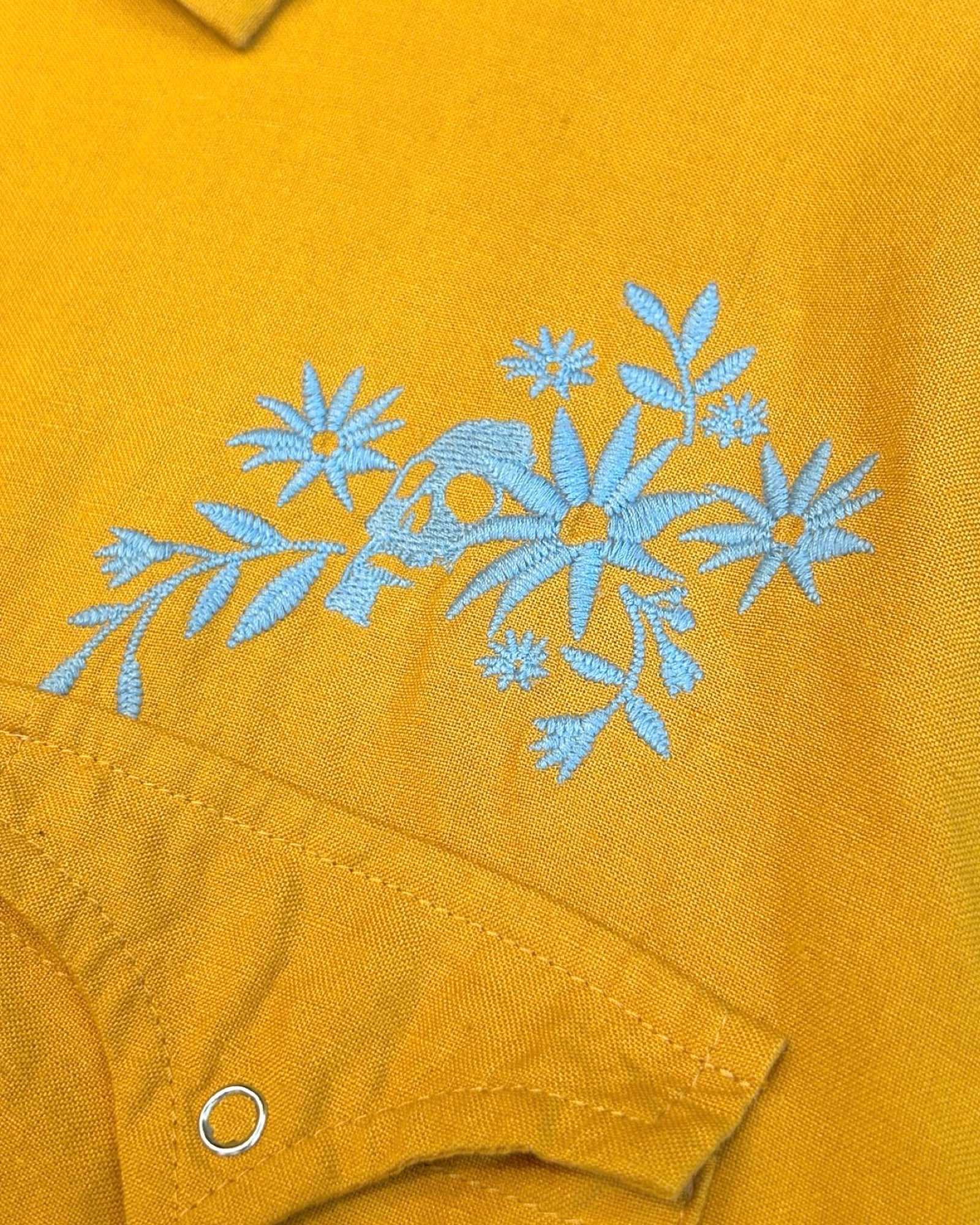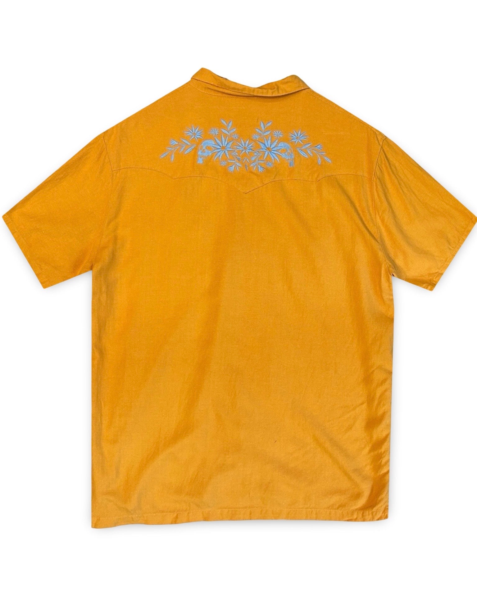 - Embroidered graphic in blue at back yoke